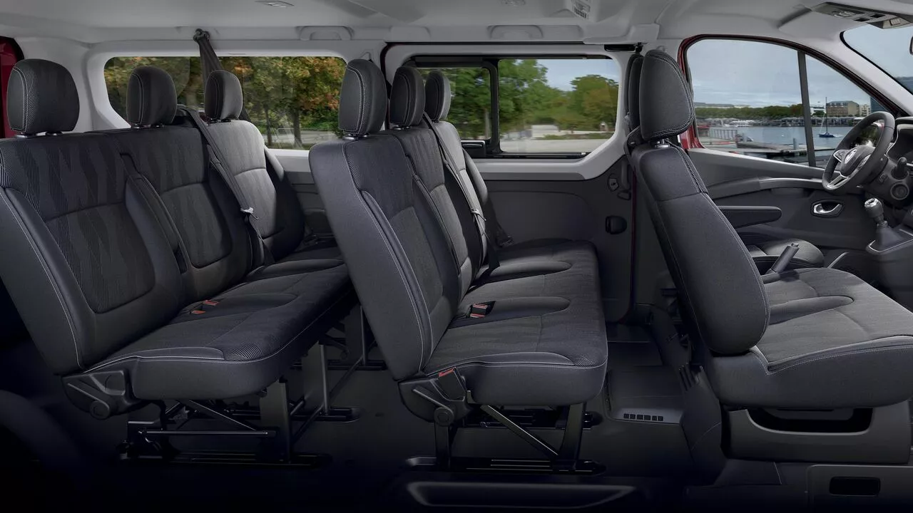 El habitáculo del Renault Trafic Combi está diseñado para ofrecer una experiencia cómoda y funcional. Su cabina inteligente incluye un cargador inalámbrico, cajón easy-life, portavasos XXL y el sistema multimedia Easy Link. Además, su zona de pasajeros es completamente modulable, permitiendo transportar de 5 a 9 personas o adaptarse a las necesidades de carga al retirar las filas traseras.